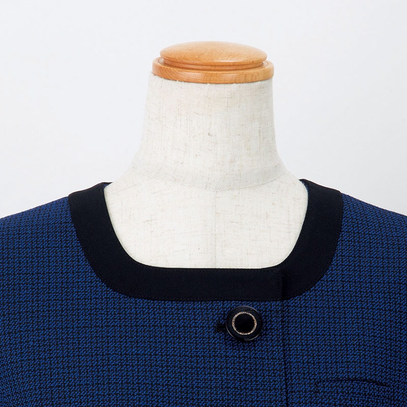 スクエア風のノーカラータイプの首元は、すっきりと大人っぽい印象。